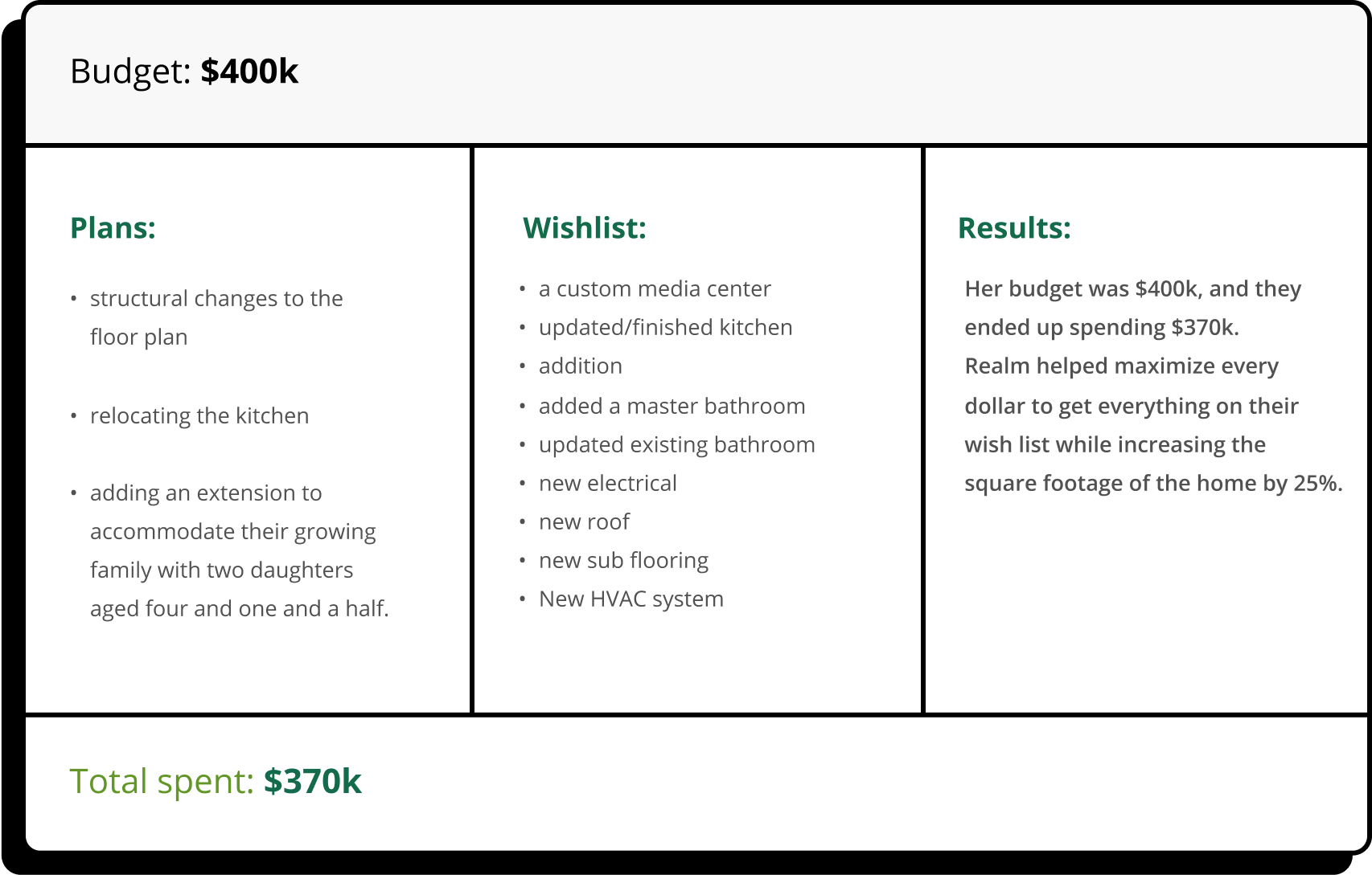 Realm helped Jackie and Floyd throughout the renovation process. Realm helped them review multiple bids and matched them with a vetted local contractor. We helped them keep their project on schedule and on budget.